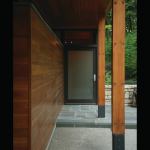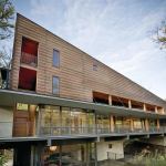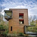 That’s not all that distinguishes this 4,850-square-foot home in a neighborhood of traditional-styled residences with manicured landscaping. Its rustic skin of red tidewater cypress is counterbalanced by large spans of glass—most notably, a double-height window wall that opens onto an 80-foot cantilevered terrace—and its lawn is on the roof, so as not to disrupt the forest floor. Measuring 23 feet wide, the structure’s slim profile spared many trees that would have been felled for a house of squarer proportions. And the few walnut trees that were cleared were locally milled and resurrected as hardwood flooring.