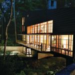 Getting building materials to the site involved some logistical wrangling. The cambered steel beam that spans the creek and supports the patio measures 66 feet long and 30 inches deep, and weighs about 9,000 pounds. “It’s the longest beam the foundry had ever rolled. The load limits over road are usually 60 feet, so we had to get permission to get the extra length over the highway,” explains architect John Senhauser. “On site, we built a temporary bridge as a way to get equipment, people, and materials across the creek. Once the house was built, we disassembled the bridge and sold it.”