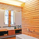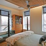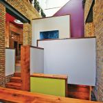 Inside, the team started by exposing original brick walls and timber floor joists that had been covered by plaster and drywall for over a century. Many of the wood joists in the basement and roof had to be replaced with engineered wood trusses to accommodate a more open plan configuration, but the old timbers weren’t trashed. Instead they were planed and planked for reuse in finished millwork, flooring, furniture pieces, and ceiling treatments. “Pretty much any wood you see other than bamboo plywood is salvage that came from inside the original house,” explains architect Jeff Goulette.