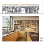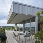 The house itself is a simple 20-foot-by-40-foot box clad in light-gauge metal and glass with a 500-square-foot wraparound deck. The plan is divided into two parallel bars (living spaces on one side and utilitarian areas on the other), separated by a 40-foot spine wall of built-in shelves and cabinets.