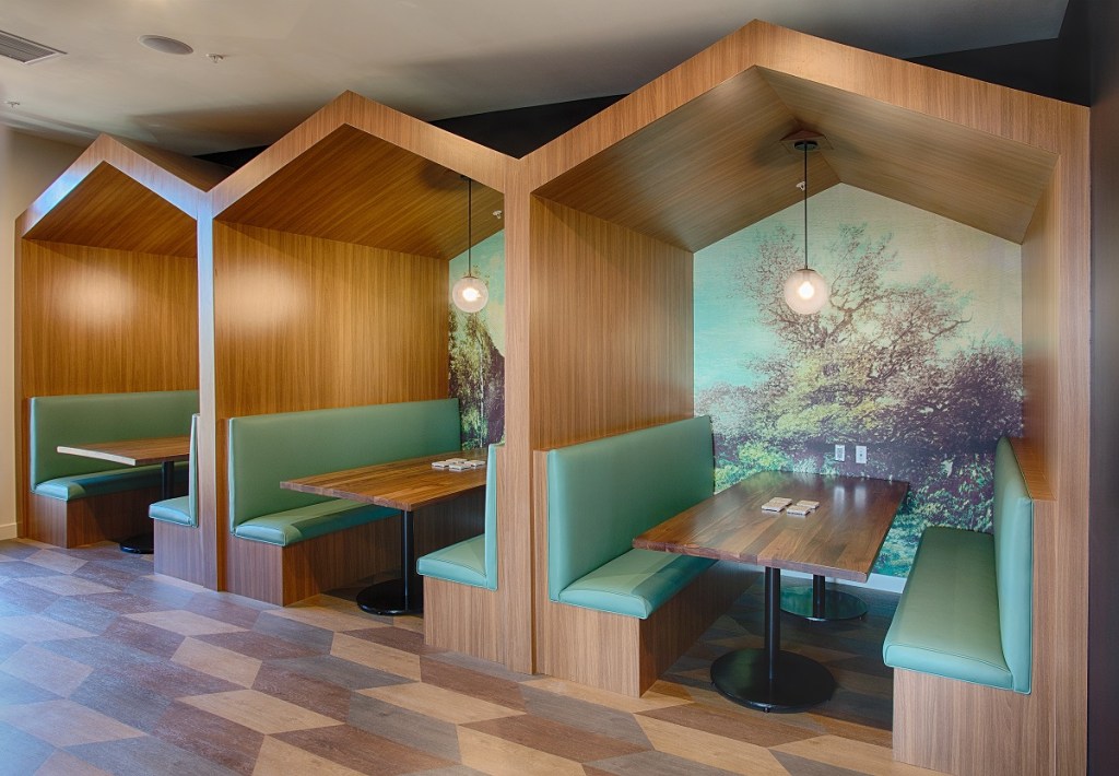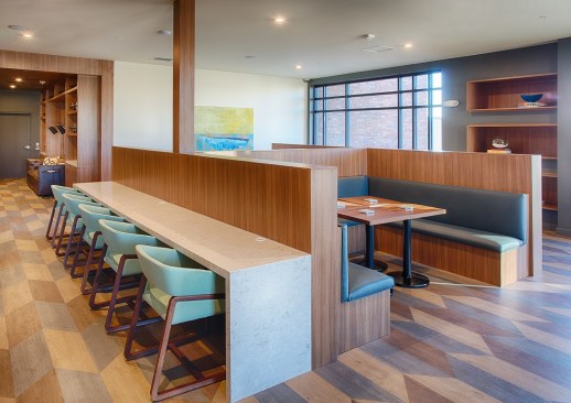 Although the development opened for occupancy pre-pandemic, the team wanted to put emphasis on the 1,600-square-foot Innovate Space, or the co-working center. The work area features a self-serve coffee bar in addition to a variety of seating types, including a mix of soft seating, bar-style seating, open booths, semi-private booths, and soundproof conference rooms, as well as a combination of outdoor seating on the balcony to accommodate a wide range of work styles.