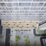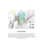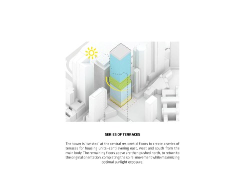 The tower’s public spaces are positioned on the first few floors, where the structure of the levels shifts back and forth to create terraces and canopies for social use. The middle section of the tower houses residential units and is designed with floor plates that slide out in a spiraling manner, creating terraces and urban views for the inhabitants. The uppermost section of the building confines office spaces to a traditional, rectangular-shaped stacked tower, aligning with the original structure at the base of the building.