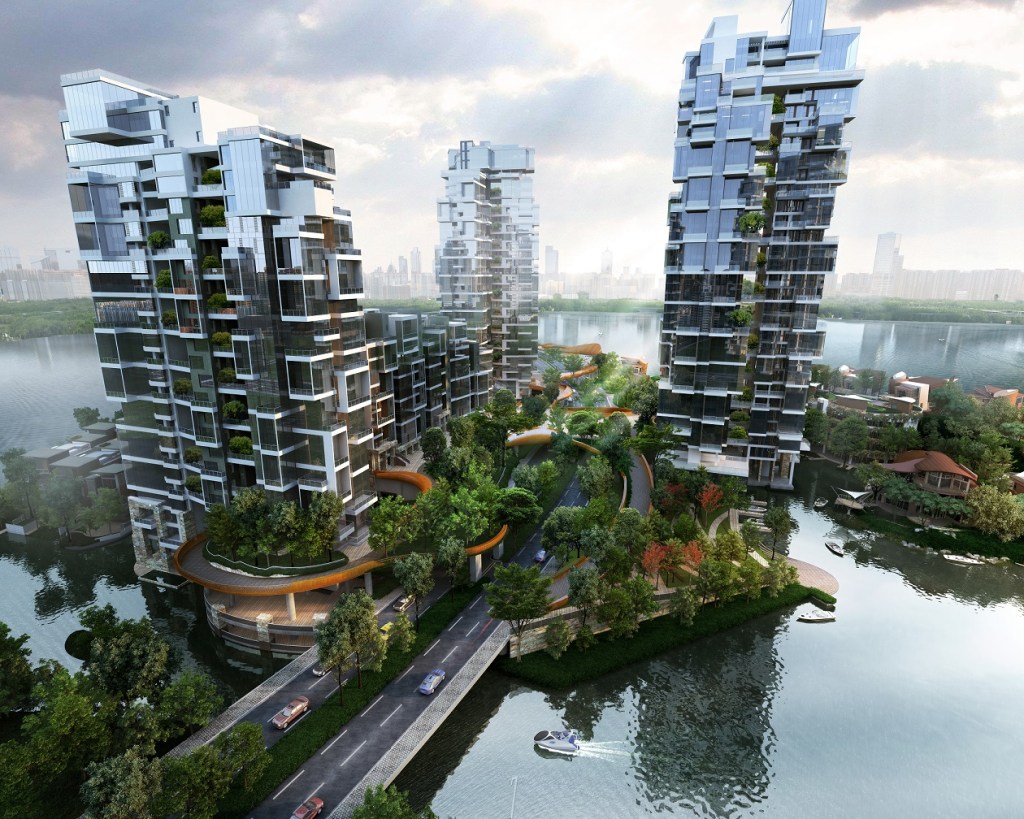On the third level, the structures will be connected by an expansive green space that stretches over a street and features recreational areas and running trails. The towers also encourage residents to take advantage of outdoor space with private gardens they pass through upon exiting the elevator to enter their unit, imparting the feeling of a front yard. Several floors also feature outdoor swimming pools.