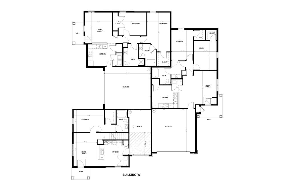 The attached garages, which vary in size depending on their location within the triplex, are designed so that they are accessible from the apartment’s kitchen. That design is a challenge, he explains, because “you practically need streets all the way around” so each garage has access to them.