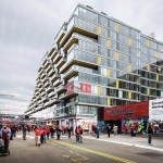 The jutting geometric terraces form an echo of the nearby stadium elevation, with the intent of creating a transition space between indoors and outdoors, and the stadium and its surrounding community, according to the architects.