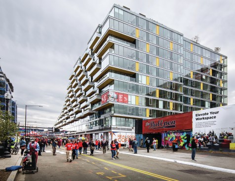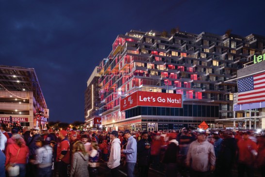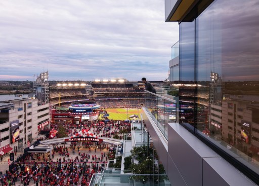 The scaled-back façade of the West Half Street residential tower, designed by ODA New York for JBG Smith, is made to unite, rather than compete, with the shape and influence of its landmark next-door neighbor—Nationals Park in Washington, D.C.