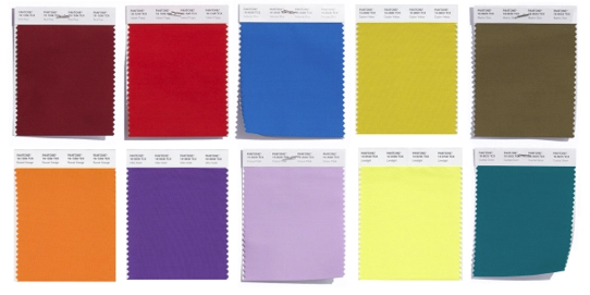 The 10 new seasonal shades (clockwise from top left) are Red Pear, a “deliciously deep red”; Valiant Poppy, “an outgoing red”; Nebulas Blue, a “thoughtful, starry-eyed blue”; Ceylon Yellow, a “savory, spicy yellow that adds an exotic touch”; Martini Olive, a “smooth, sophisticated and urbane green”; Russet Orange, a “warm and earthy forest floor orange”; Ultra Violet, the company’s purple pick for Color of the Year; Crocus Petal, a “light, airy, and refined hue”; Limelight, a “pungent yellow-green” that’s “animated and effervescent”; and Quetzal Green, a “deep, elegant blue-green hue suggestive of rich plumage.”