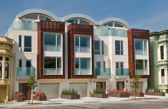 NOVE, a nine-unit infill project in San Francisco’s Mission District, isn’t Victorian like the neighboring homes that have been there since 1896. It’s contemporary [and proud of it], although it shows due respect for its elders with bays that align with their cornice details and a scale that matches the rhythm of the street. At the same time, the new homes bring variety to the scene with a crisp and durable palette of stucco, Hardieplank, frosted glass, aluminum, and ipe. But NOVE—whose name is Italian for nine—is more than just a pretty face. It’s also top-of-the-line green. Certified LEED Platinum, the sleek, market-rate residences, which range from 1,200 to 1,600 square feet, are outfitted with Alumatherm thermally broken windows, blown-in blanket insulation, and permeable landscaping. Prefabricated panelized wall systems helped minimize jobsite waste, and rooftop solar hot water collectors feed both domestic hot water and space heating needs. What the project doesn’t have is photovoltaic panels.