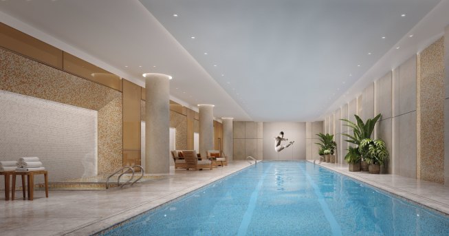 Other opulent details include chef’s kitchens with built-in high-end appliances, Turkish marble countertops and backsplashes, spa-inspired marble master bathrooms, and custom-made cabinetry. The lower level features a suite of swimming pools, consisting of an 82-foot pool, plunge pool, salt pool, and hot tub, complemented by a sauna and steam room and a state-of-the-art fitness center. Also included are a half-court basketball court, bowling alley and game lounge, and children’s playroom with a custom climbing gym. The developer is targeting LEED Gold certification.