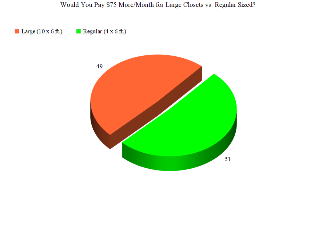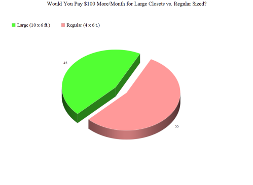 In fact, in-unit storage space is such a desired design feature that nearly half of all renters (49%) are willing to pay at least $75 more per month for larger closets (10 feet by 6 feet) rather than try to cram their belongings into standard-sized closets (4 feet by 6 feet) for a lower rent.