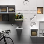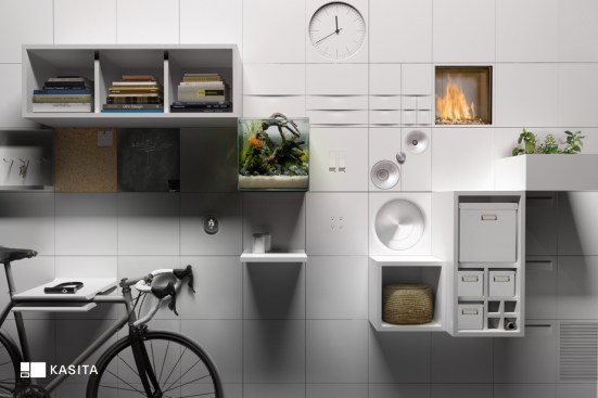 The units’ interior walls are outfitted with modular tiles that residents can customize to create shelves, gadgets, and different finishes—anything from key hooks and cork boards to fish tanks and wall speakers.