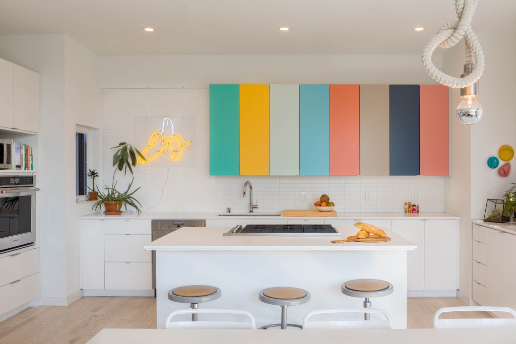 In addition to the ADU spaces, the exterior of the modular structure is covered with black metal cladding and varying window sizes. Custom pink powder-coated details and a rooftop mural give the project unique pops of color.