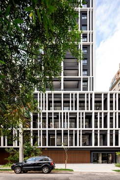 The bold façade framework and black-and-white color contrast are inspired by the body paintings of Brazil’s indigenous Tupi-Guarani people, as the building is located on Bartira Street, named after a famous member of the tribe. The ground floor has no railing or gates, and it flows directly into the sidewalk to facilitate spaces for meetings.