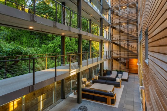 Adding to the visual splendor is an engaging walkway structure in the back that showcases the verdant forested area surrounding the structure. The property’s many technology features include EV charging stations for all units in the secure indoor parking area, making it among the nation’s first to go all-in on EV charging.