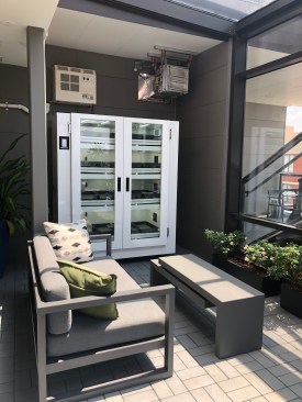 In addition to the hydroponic garden, the terrace also functions as a greenhouse-like social space—complete with floor-to-ceiling glass walls, a partial glass roof, and indoor plants. Residents can gather and relax on the terrace’s couches and chairs or utilize the garden to grow food for a farm-to-table experience in either their private units or the community’s demonstration kitchen.