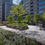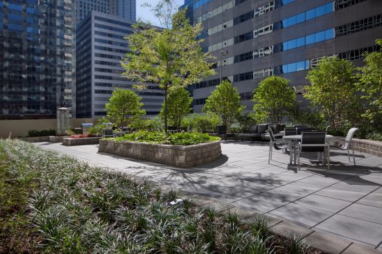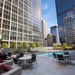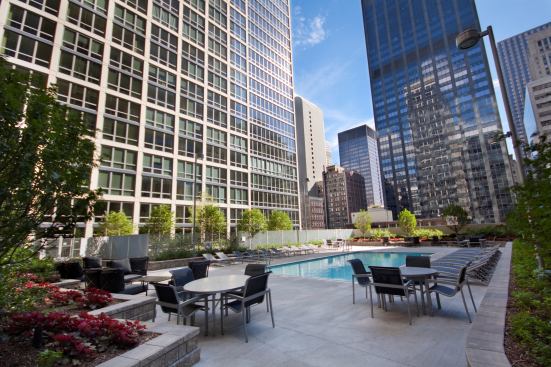 The building envelope helps to maximize views of downtown Chicago with floor-to-ceiling glass and aluminum window walls and insulated concrete structural walls. The landscaped green roof of the parking garage reduces the heat island effect and contains a 40-foot-long swimming pool, a lounge area, and an outdoor grilling center.