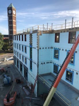 The university needed an affordable way to silence this deafening cacophony for 900 first-year students. Drake’s design team worked with engineers to identify a building system that would affordably seal off noise pollution. “Wood wasn’t an option. So, we carefully investigated structural steel frame, concrete masonry units, and cold-formed steel,” the architect recalls. “ICF proved to be the least expensive option.”