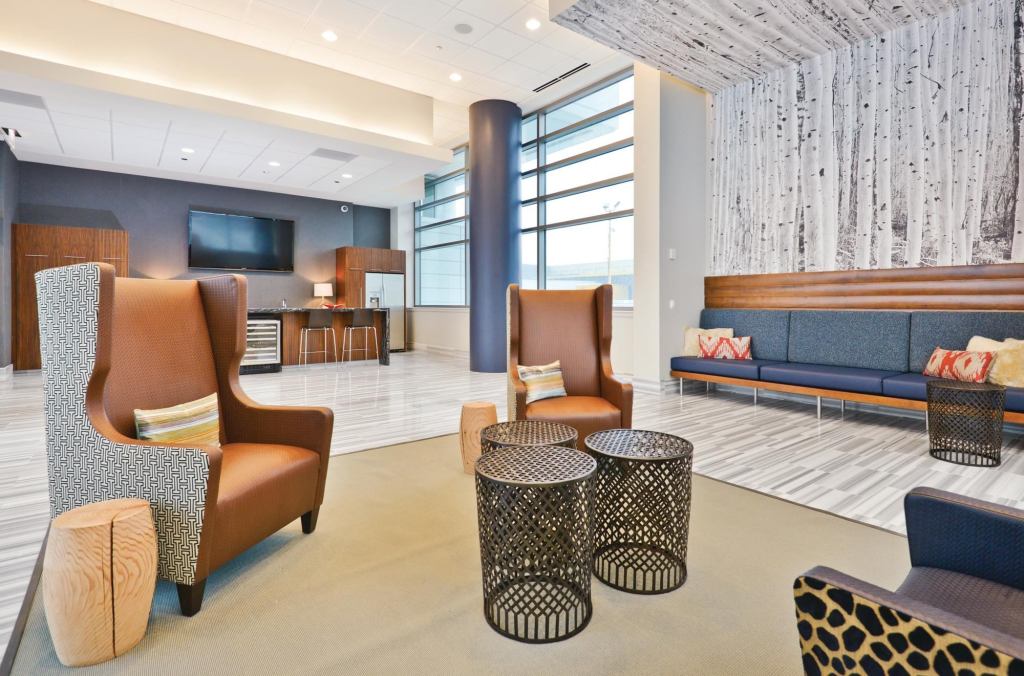 Having the latest amenities in public spaces was another necessity to attract young professionals. “We had to sell a lifestyle, and it’s a game of increments to lure someone to your building instead of to another,” says Kidd. Perks were organized on one level for ease and include two lounges; a party room with a kitchen; a theater with café-style seating and tables; a yoga studio; a basketball court; a coffee bar; and doggie day care. A concierge orchestrates activities, including parties, classes, and charitable events.