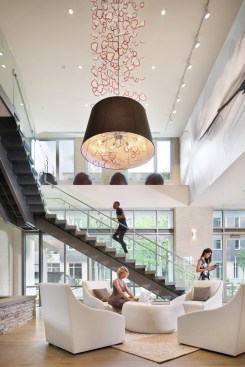 Inside, a centerpiece glass stairwell encourages residents to climb the stairs and develop everyday habits that lead to better health. Friendly reminders are also in place at elevator call areas promoting the health and environmental benefits of taking the stairs.