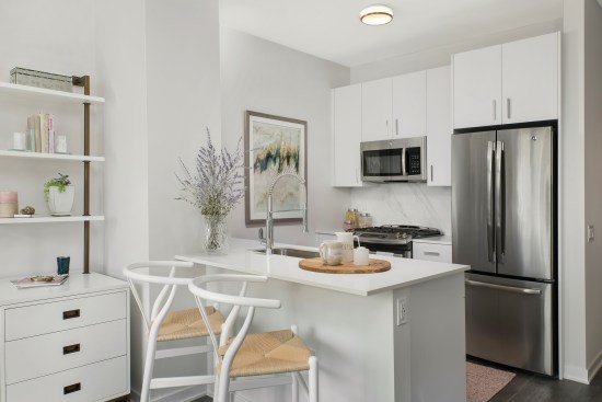 Each of the units features quartz countertops, plank flooring, frameless glass showers or tubs, and high-end faucets. The kitchens, inspired by American designer Mick De Giulio, include marbled porcelain backsplashes, white soft-close cabinets, and stainless steel appliances and range hoods. The apartments also offer smart thermostats, blackout window shades, and oversized windows with views of the city skyline and Lake Michigan.