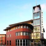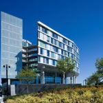 The 360-degree design features a pixilated glass façade comprised of 16 different types of glass that reflect diversity, motion, and interaction among floors. A 10-story fritted glass studio tower anchors the northern side of the building, partially shielding noise from the highway while functioning as a billboard for showcasing student art.