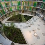 Additionally, rainwater runoff from the roofs is collected in gutters and carried through to underground pipes to a large concrete cistern, which irrigates all landscaped areas on the site. Drought tolerant landscaping and a zoned irrigation system reduces the amount of water needed for landscaping.