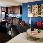 The common areas were designed to reflect the upscale tastes and preferences of the demographic group. Four outdoor sky terraces all have views of either downtown L.A., Sunset Boulevard, or the Hollywood Hills, while a bar and entertainment lounge connect to the rooftop infinity edge pool.