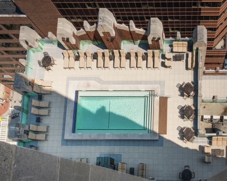 The building had a 25,000-gallon rooftop water storage tank on the north shoulder of the building, which the company used to create a rooftop saline pool when adapting the historic former Bank of America building into apartments.