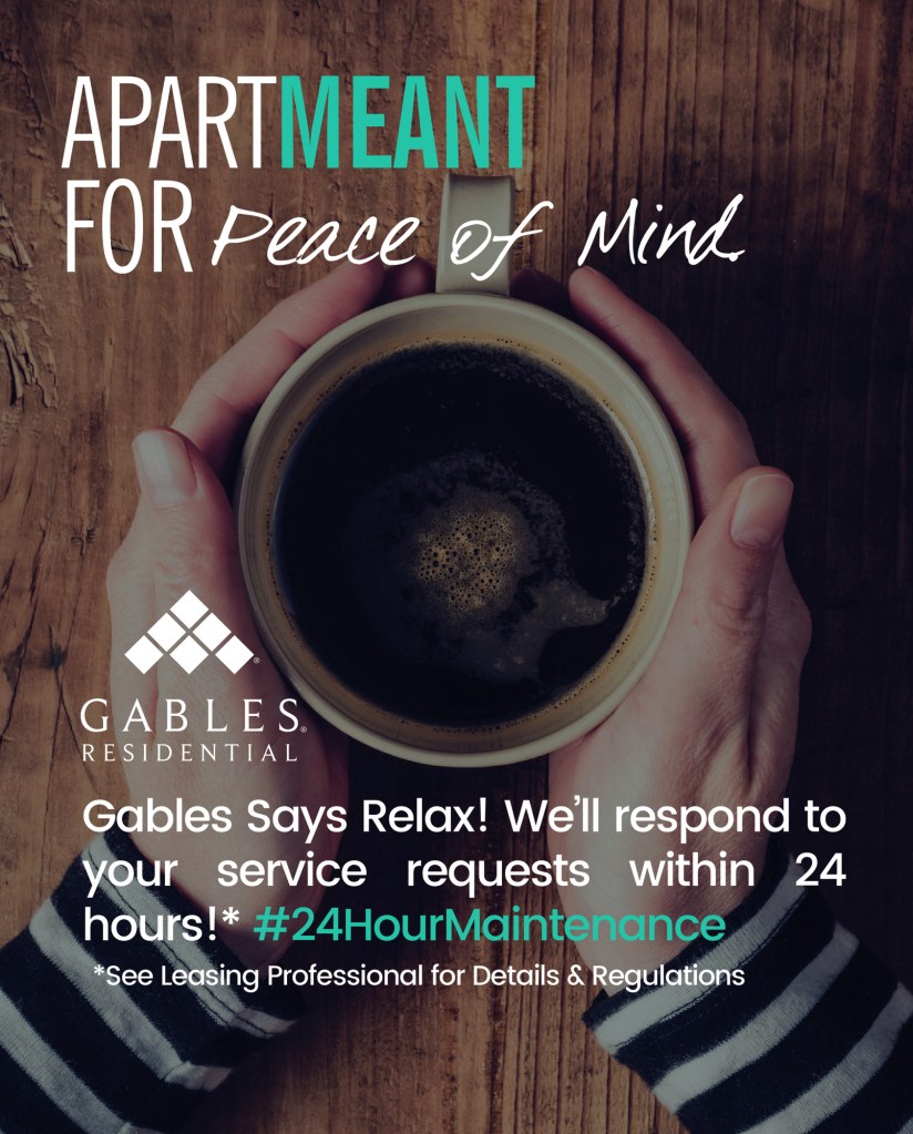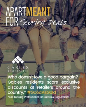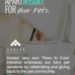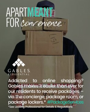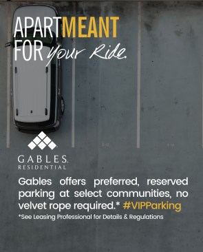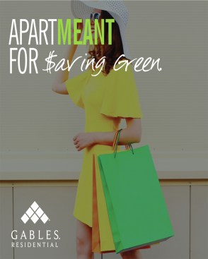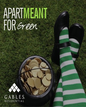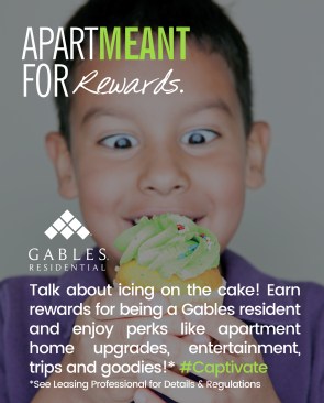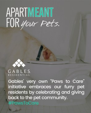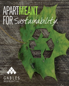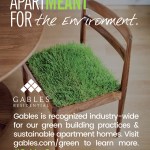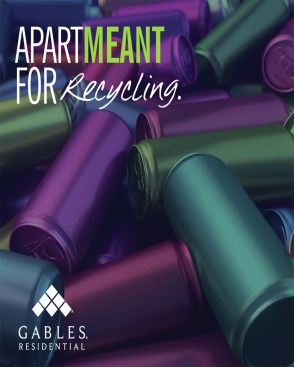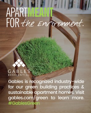 Dubbed the “ApartMEANT Campaign,” the message is told in storyboards that showcase what’s important about living at each site through a bold image and succinct text. (Example: The ApartMEANT Campaign for the Environment contains an image of a chair with a seat of grass and the message, “Gables is recognized industrywide for our green building practices and sustainable apartment homes.” Another: The ApartMEANT Campaign for pets shares that its “Paws to Care” initiative embraces furry-pet relatives by celebrating and giving back to the pet community.) Other storyboards reflect the building’s amenities, such as reserved parking or different services to receive packages safely.
