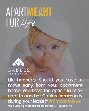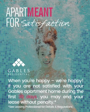 Besides having a powerful visual impact, the campaign is affordable: For 10 signs, the cost per community was $52; for digital ads on Gables’ apartmentratings.com and Facebook page sites, the total was $1,040. Results have already reached 72,000 impressions, considered good for an internal campaign, says Gigi Giannoni, the company’s vice president of marketing and public relations. The overall impact offers residents a “warm, fuzzy feeling,” she says.