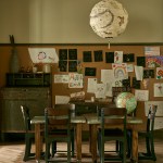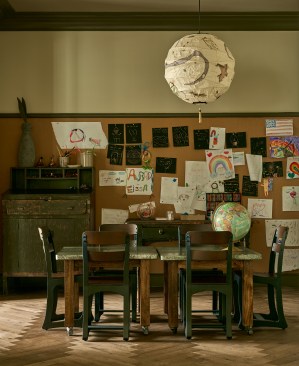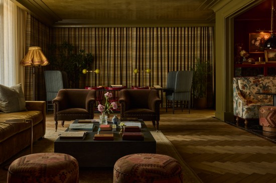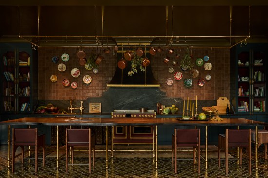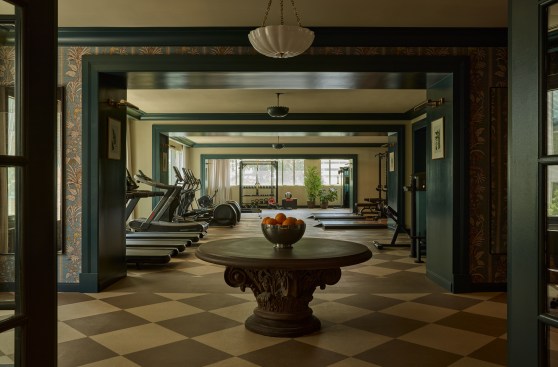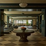 According to Edit at Streetsense, the amenity spaces are serene and welcoming as well as dark and moody instead of light and bright. A Nancy Meyers-esque kitchen provides a dramatic backdrop for entertaining with a 16-foot-long island; the mailroom offers a library-like appeal and wraparound wallcovering frieze; the fitness center has patterned wall coverings and a broad welcoming table; and the children residing in the high-rise have a studio playroom of their own with the same sophistication as the rest of the building.