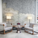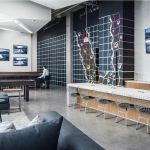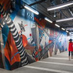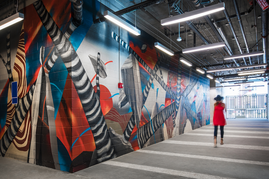 During his residency, Fisher collaborated with international artists to paint several murals throughout the building, including one for the building exterior facing Olive Street. Wolff purchased other pieces of art from Fisher to adorn the walls at OLiVE in addition to other artwork by local creatives displayed throughout the property.