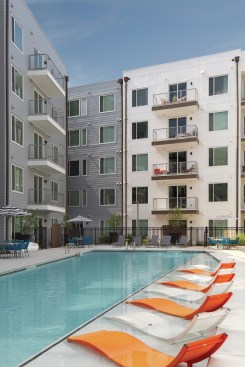 The north and west sides slope down to face the MARTA and an older multifamily project and feature two types of balconies—some with forward-slating solid faces and others set into the façade with full-height wooden screens to deflect rail noise.