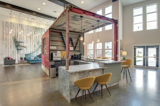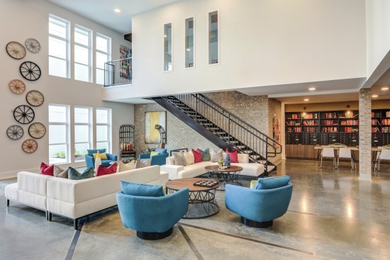 Each of the one- to three-bedroom units features spacious living areas and floor-to-ceiling windows. Community amenities include a Peloton fitness center, a saltwater pool, a bark park, a sky lounge, and indoor bike storage.