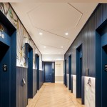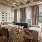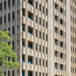 The adaptive-reuse strategy included modifying the building’s tube-style concrete and pan-joist structural frame to create open balconies for the residences. Without impacting the building’s structural integrity, some of the exterior tube columns were removed to add the balconies, and that concrete was reused as benches in the ground-floor plaza. The team also retained defining characteristics and finishes to respect the original architecture. The open-concept floor plans of the one-, two-, and three-bedroom apartments feature exposed concrete, natural wood finishes, wall paneling, chair railings, and shaker-style cabinetry.