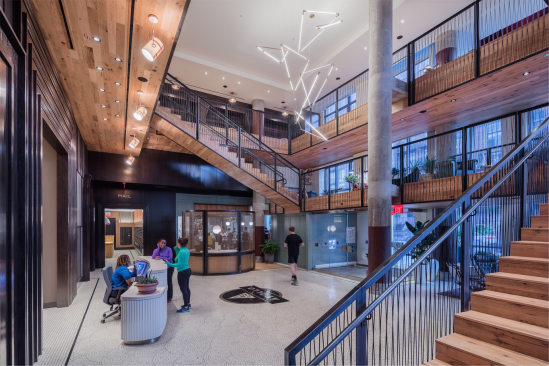 Since The Apollo opened, in November 2016, it has served as the “de facto living room” for the H Street neighborhood , according to Insight Property Group partner Trent Smith. The Wydown Café storefront to the left of the building’s main entrance feeds directly into its three-story lobby and lounge, which features art deco design elements by EditLab at Streetsense, inspired by the architecture of the property’s former Apollo Theater.