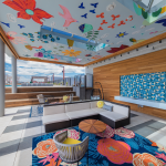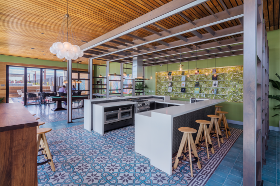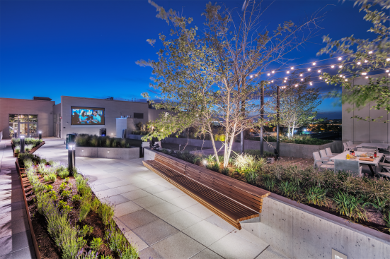 On the rooftop, residents can access a conservatory event space with a green roof as well as a clubhouse with a show kitchen, indoor fireplace, and table games. The east rooftop features four grilling stations and a movie projector, while the west rooftop has a two-tiered outdoor pool and fireplace.