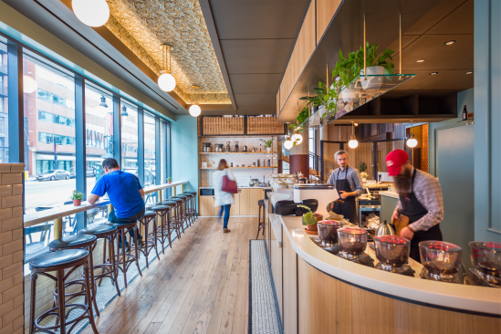 The community is pending LEED Gold certification and utilizes energy-efficient fixtures and green power sources and cleaning methods. The roof and conservatory spaces feature vast green plantings, and several dozen garden plots are located on-site for resident and retailer use alike.