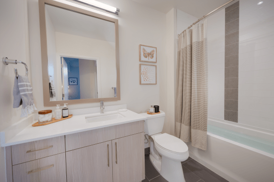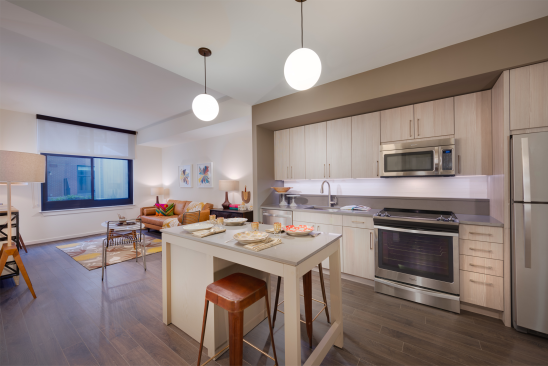 The 431 residential units range from studios to three-bedroom apartments, with 439 to 1,518 square feet of living space and monthly rents ranging from $2,150 to $4,500. Resident amenities include a guest suite, a gym with a private studio and boxing area, a dog wash and dog run, bike storage, and a lending library of cookbooks and household tools.