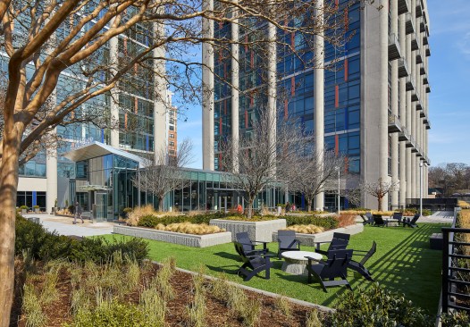 Bonstra | Haresign Architects undertook a project transforming two 14-story 1980s brutalist office buildings in Alexandria, Virginia, into a multifamily residential community. The design team sought to preserve the existing concrete structure and exterior precast panels of both buildings while improving the building envelope performance and re-imagining hard exterior surfaces and underused parking areas into attractive amenity spaces for residents and the general public.