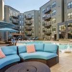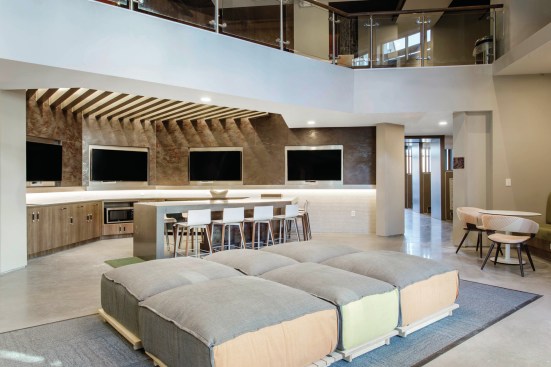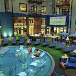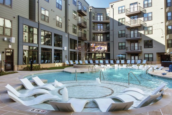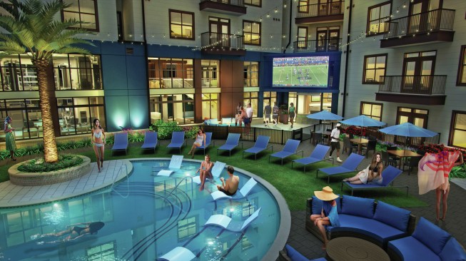 Campus Apartments designed the community with four courtyards that feature fire pits, grilling stations, hammock lounge areas, game courts, and green space. The project in addition features a 12,000-square-foot, two-story clubhouse; a pool table and arcade game room; a resort-style pool with jumbo TV; a fitness center; and a complimentary coffee bar for late-night study hours or early-morning classes.