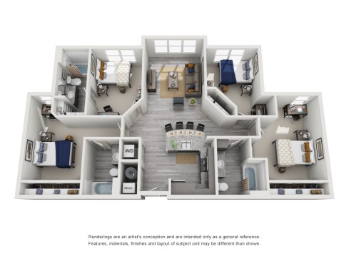 Several units have in-suite baths, stainless steel appliances, and kitchen islands with a breakfast bar, and each comes with a 48-inch LED HDTV. Residents can choose from studios and two-, three-, four-, and five-bedroom layouts.