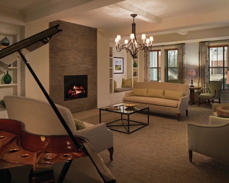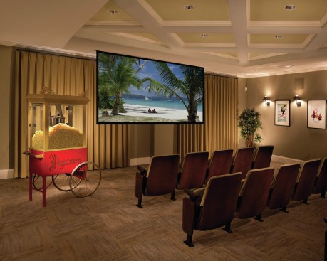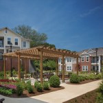 Given the community’s 62-and-older population, a sense of independence was important and was conveyed via the gardens, where residents can grow flowers and vegetables; a lushly landscaped pergola; and, indoors, a gym, movie theater, and communal kitchen with tables. Residents can make overnight visits from loved ones easier with the complex’s hospitality suite.