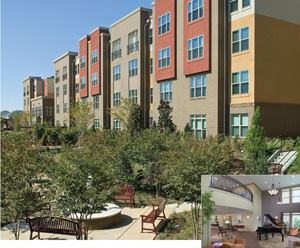 With construction costs of roughly $73 per square foot, Columbia Senior Residences features common amenities such as a theater, dining and dance hall, exercise facility, and library. Outdoors, residents can enjoy a heavily landscaped courtyard with seating and meditation areas, walking paths, a community vegetable garden, and a pond, which also handles stormwater retention.