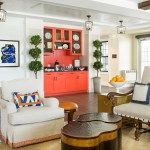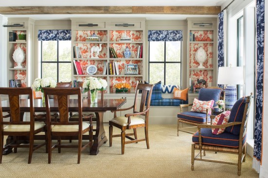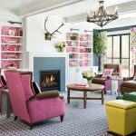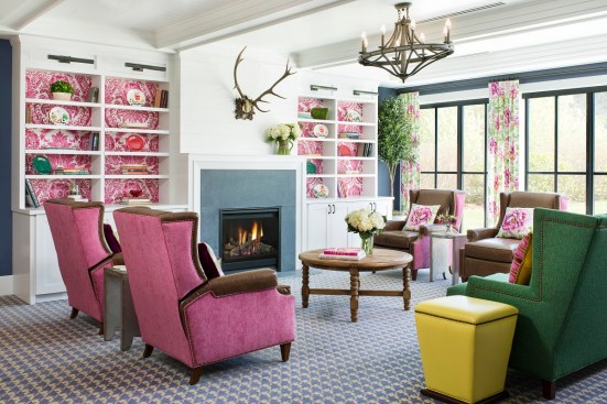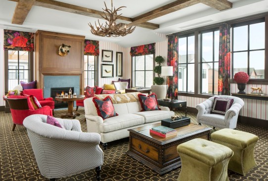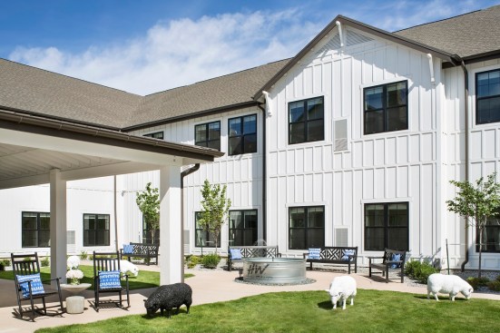 The developer partnered with Davis Wince Architect and Brinkmann Constructors to build the 74-unit building on 2 acres. Besides the farmhouse accents, the great room admits abundant natural light, with its massive wall of windows, and showcases fun pops of bright orange, blue, and pink.
