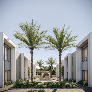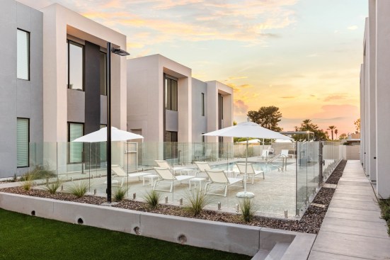 In addition to offering views of Camelback Mountain, the community boasts an array of amenities. The gated community pool echoes the homes’ contemporary exteriors and is accompanied by a private cabana and comfortable poolside seating. Sustainability extends to the amenity package as well with ample covered parking equipped with electric vehicle charging stations.