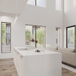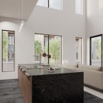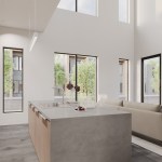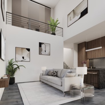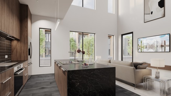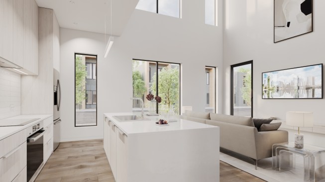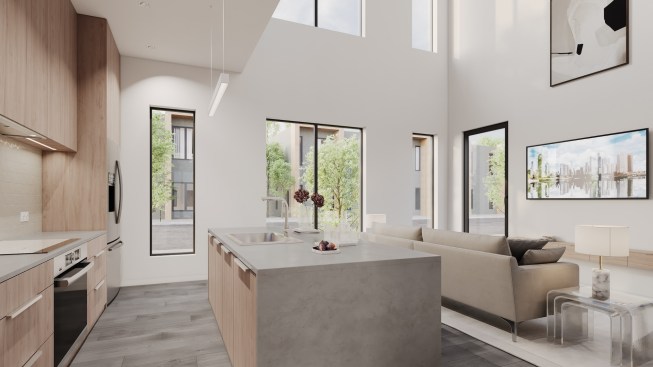 The homes are finished with modern interiors featuring European-style cabinetry, composite quartz countertops, stainless steel appliances, and ceiling heights up to 22 feet high.