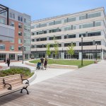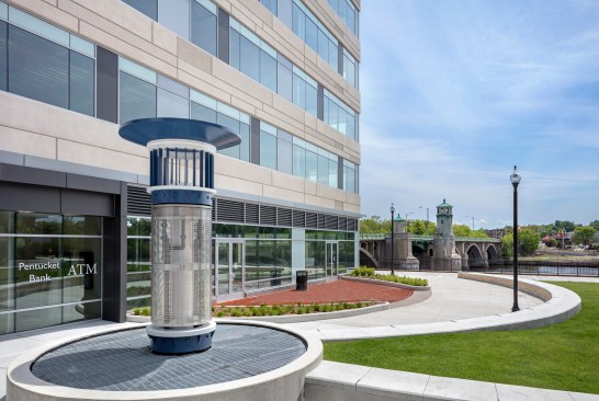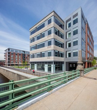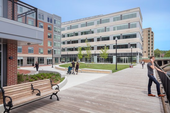 One of the project’s main obstacles was a 10-foot concrete wall on the site, built after a flood in 1936, which restricted access to the Merrimack River and blocked it from view. To create access to the river without removing the wall, the development team raised the area’s grade by 10 feet. The Harbor Place property is built into a raised platform level with the top of the wall, with the new public plaza and boardwalk restoring pedestrian access to the river. The platform also allowed developers to create below-grade parking with additional excavation or new retaining walls.