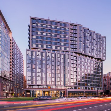 The building’s exterior creates the appearance of stacked boxes above a tall, mixed-use ground floor. Each box contains a flush façade when that portion of the building aligns with the building restriction line and sawtooths on the orthogonal when accommodating the other site angle. The boxes’ sawtooth articulations alternatively look north toward the Pentagon or south toward the early stages of National Landing in Arlington.