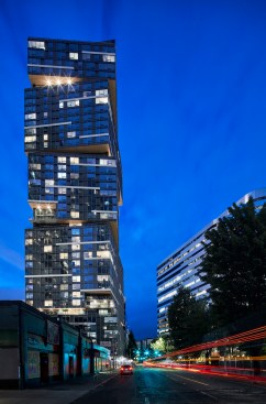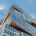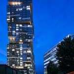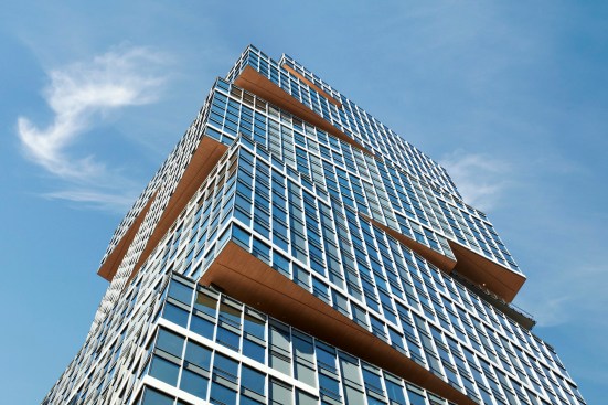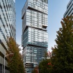 The tower’s concept was derived from the idea that a building could present a dynamic expression rather than static form. The overall massing is broken down into five cube-like elements, each shifting four degrees away from each other, creating eight degrees of rotation, and implying motion. Deep reveals between the twisting cubes serve as inset wraparound terraces, adding large amounts of exterior space and breaking down the tower’s scale.